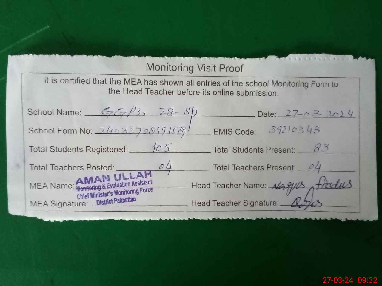 | EMIS Code: 39210343 | Name of School: GGPS 28 SP | |||