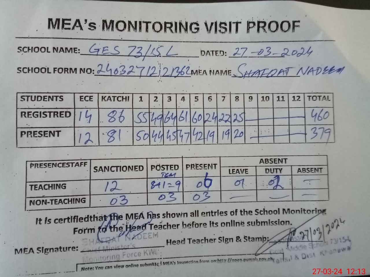 | Attendance Register | Head Teacher | MEA with School | Visit Proof |