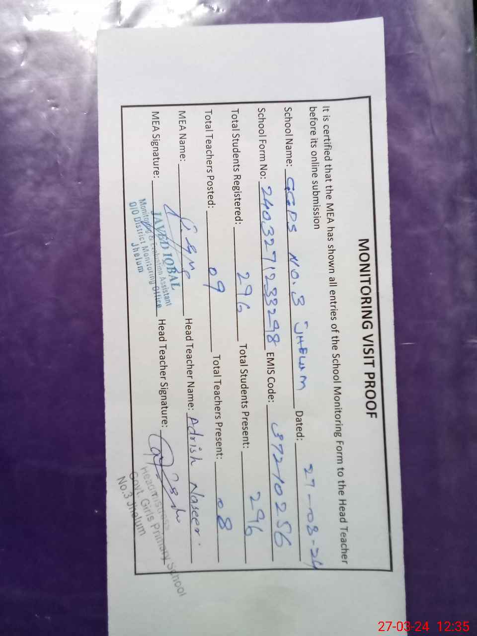 | EMIS Code: 37210256 | Name of School: GGPS NO. 3 JEHLUM | |||