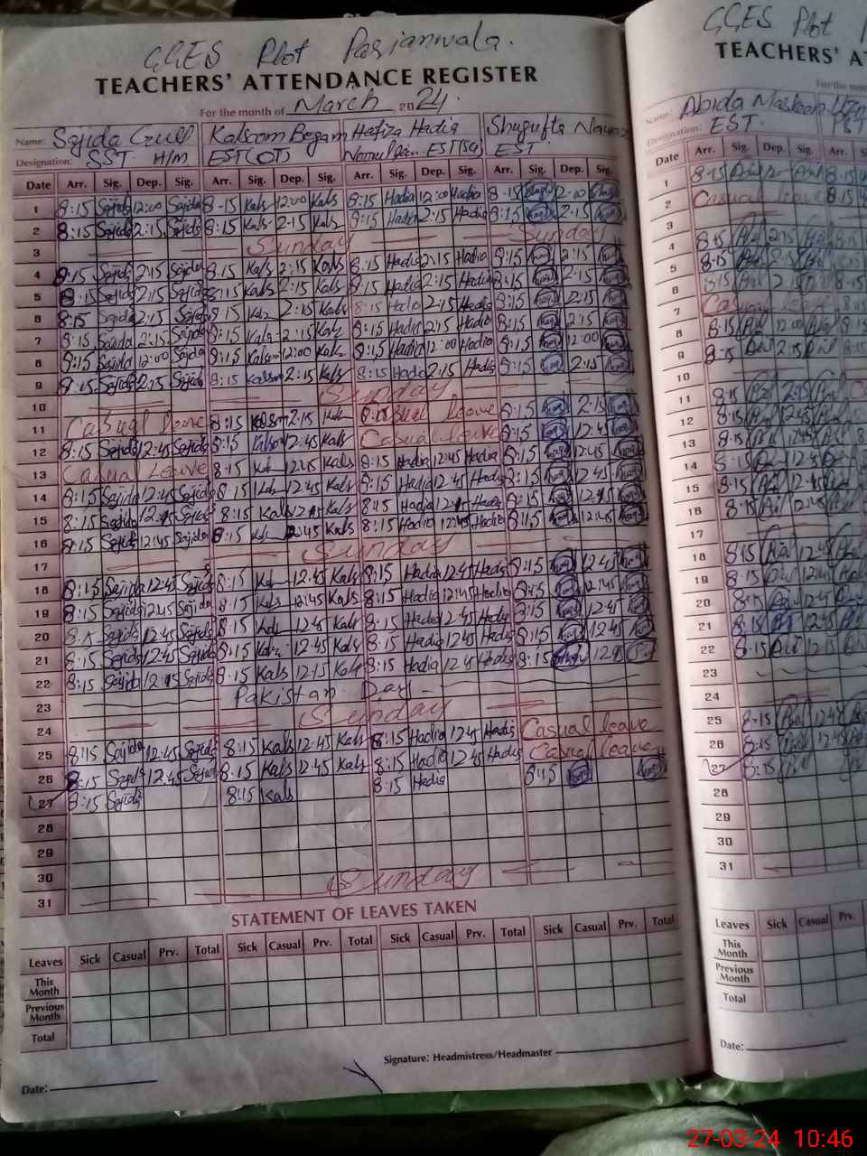 | Leave | Duty | Absent | Maternity | Medical | Ex- Pak |