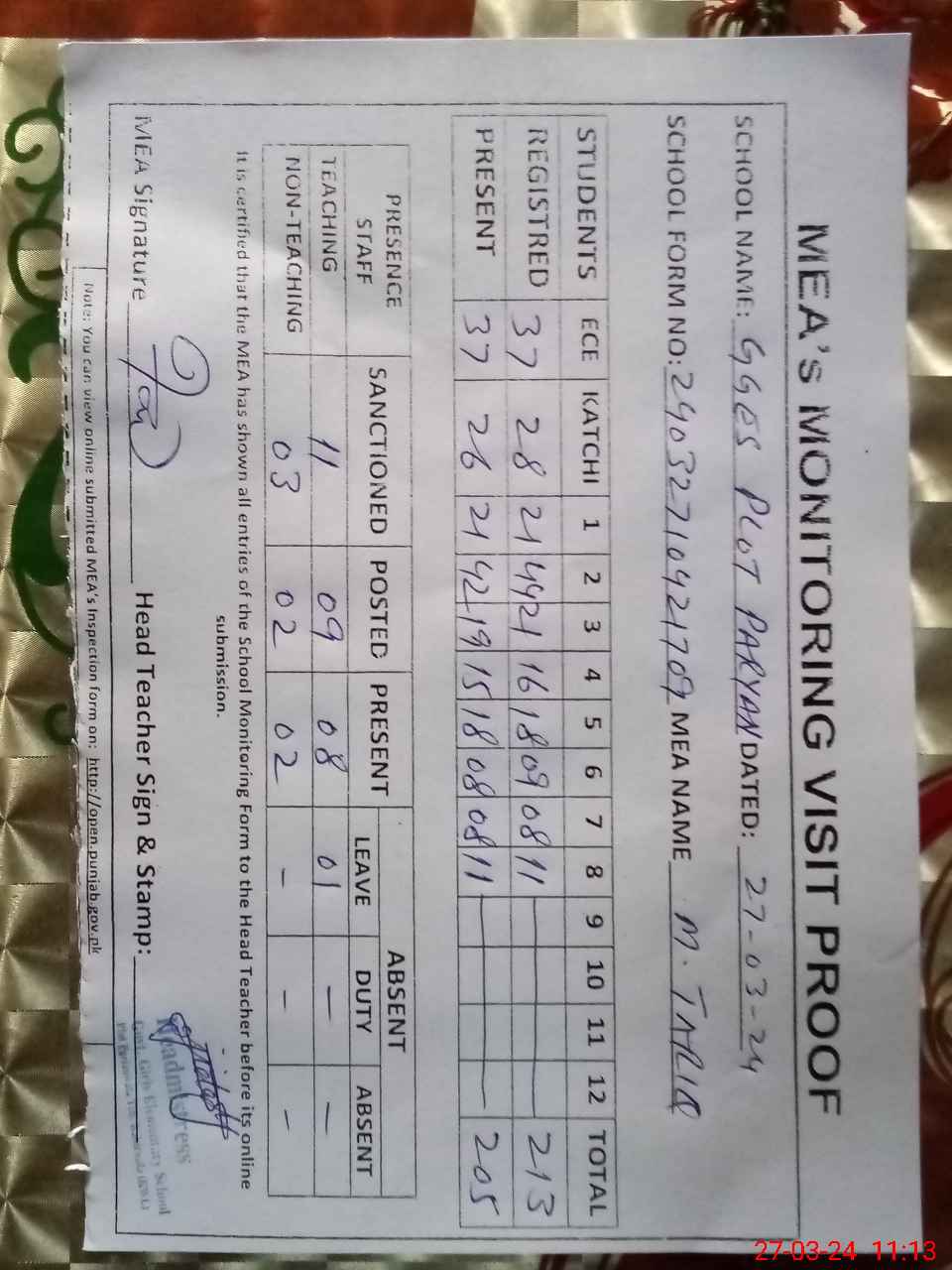 | Attendance Register | Head Teacher | MEA with School | Visit Proof |