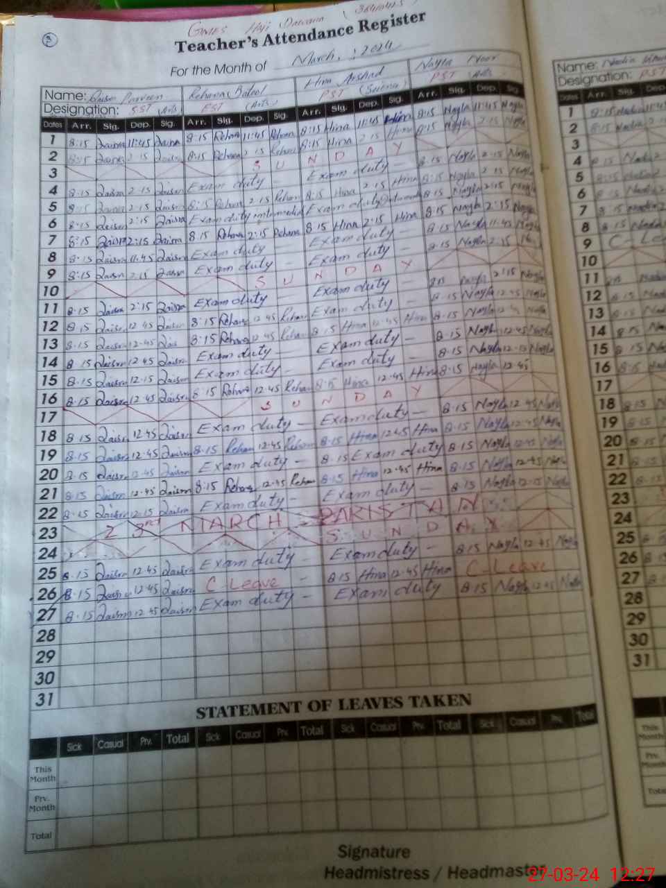 | 36**** | Hi**** Ar**** | PST | Regular | 0 | 0 | 0 | 0 | 0 | 0 | 0 | 0 | 0 | Exam Duty |