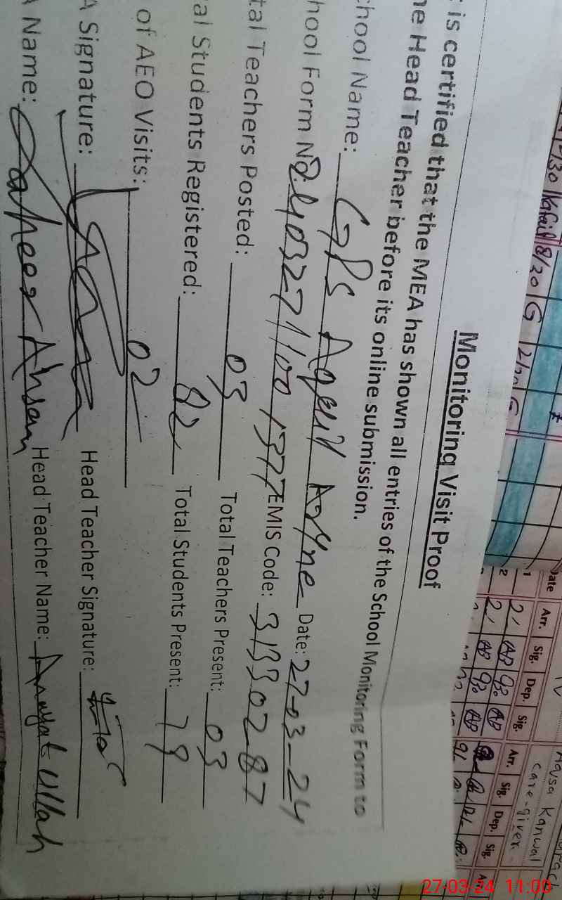 | Attendance Register | Head Teacher | MEA with School | Visit Proof |