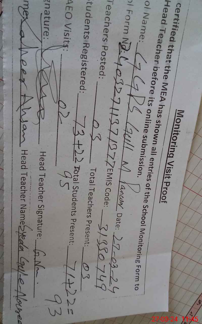 | Attendance Register | Head Teacher | MEA with School | Visit Proof |
