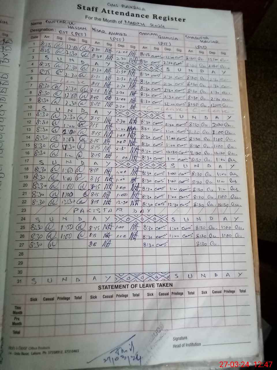 | CNIC | Full Name | Designation | R/C | Absence During Last Calender Month |