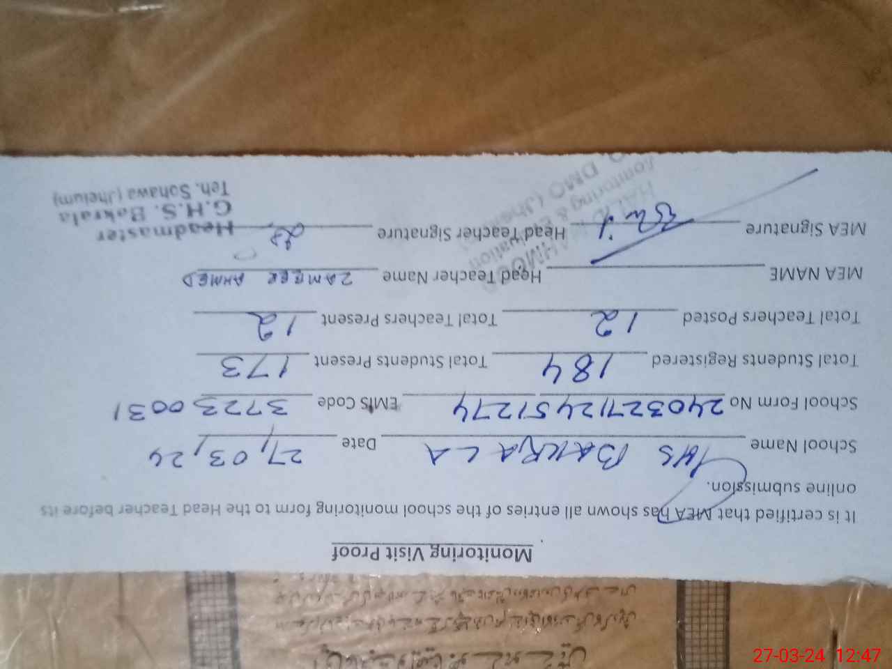 | Attendance Register | Head Teacher | MEA with School | Visit Proof |