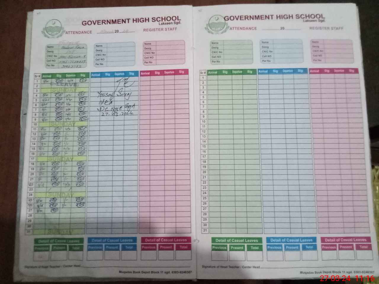 | CNIC | Full Name | Designation | R/C | Absence During Last Calender Month |