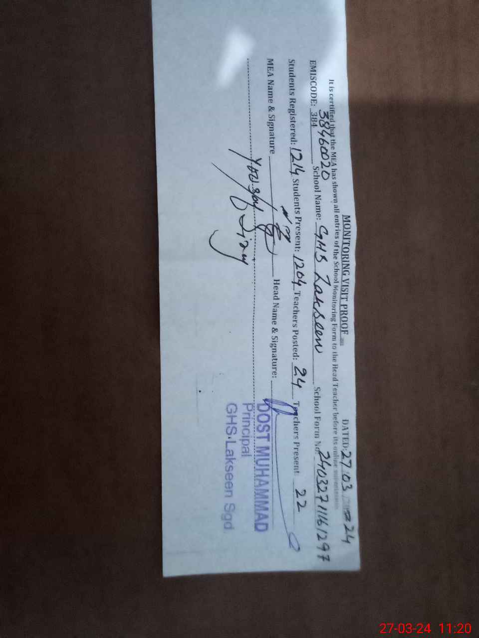 | Attendance Register | Head Teacher | MEA with School | Visit Proof |