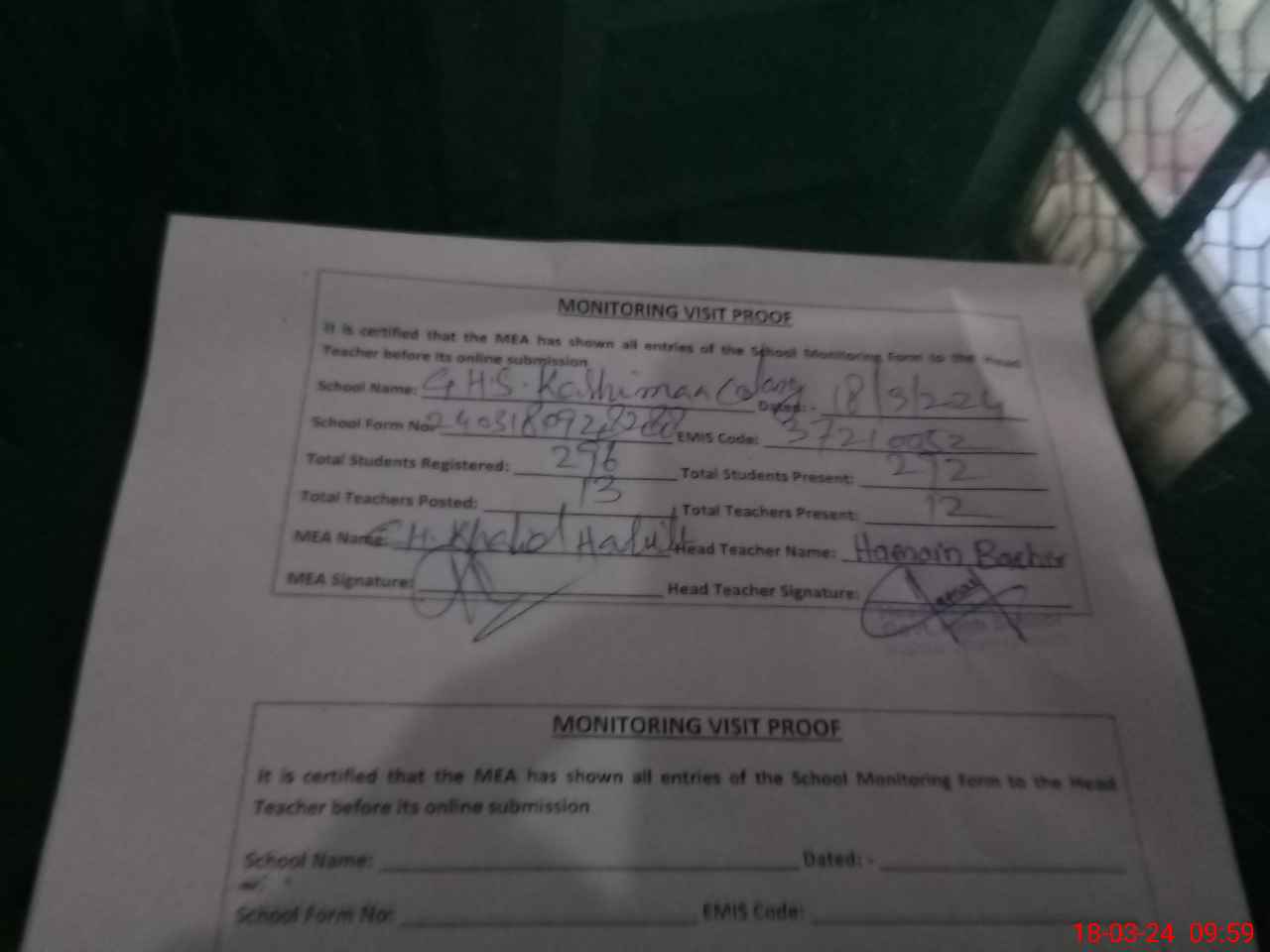 | Attendance Register | Head Teacher | MEA with School | Visit Proof |