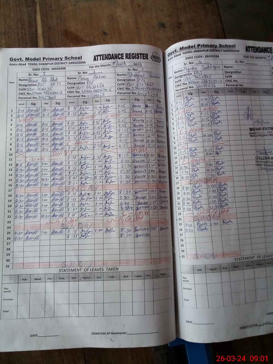 | Name: IH**** AL**** SH**** Designation: (School Headmaster's/Headmistress's) PST Phone/Cell Number: 03**** |