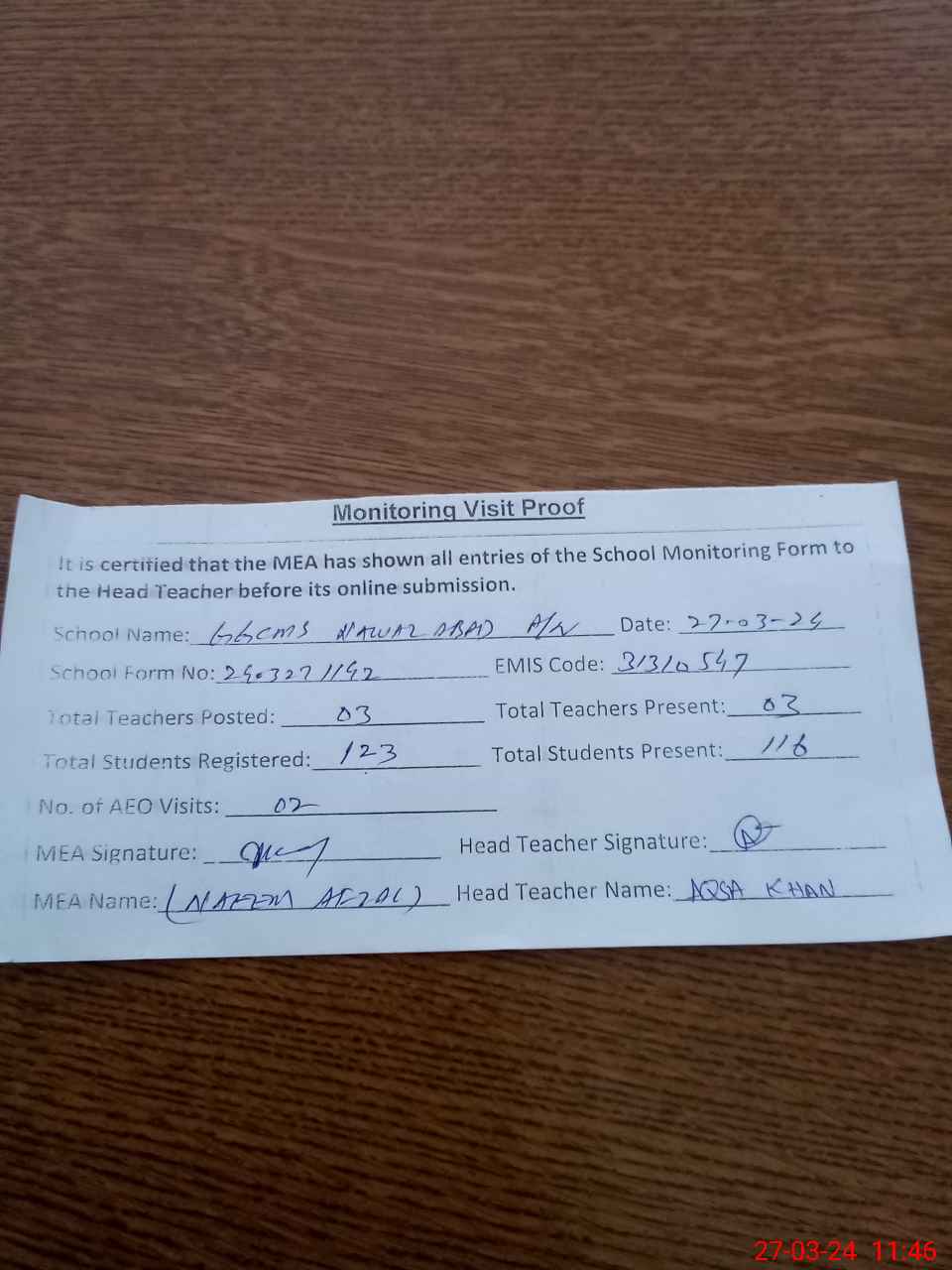 | Attendance Register | Head Teacher | MEA with School | Visit Proof |