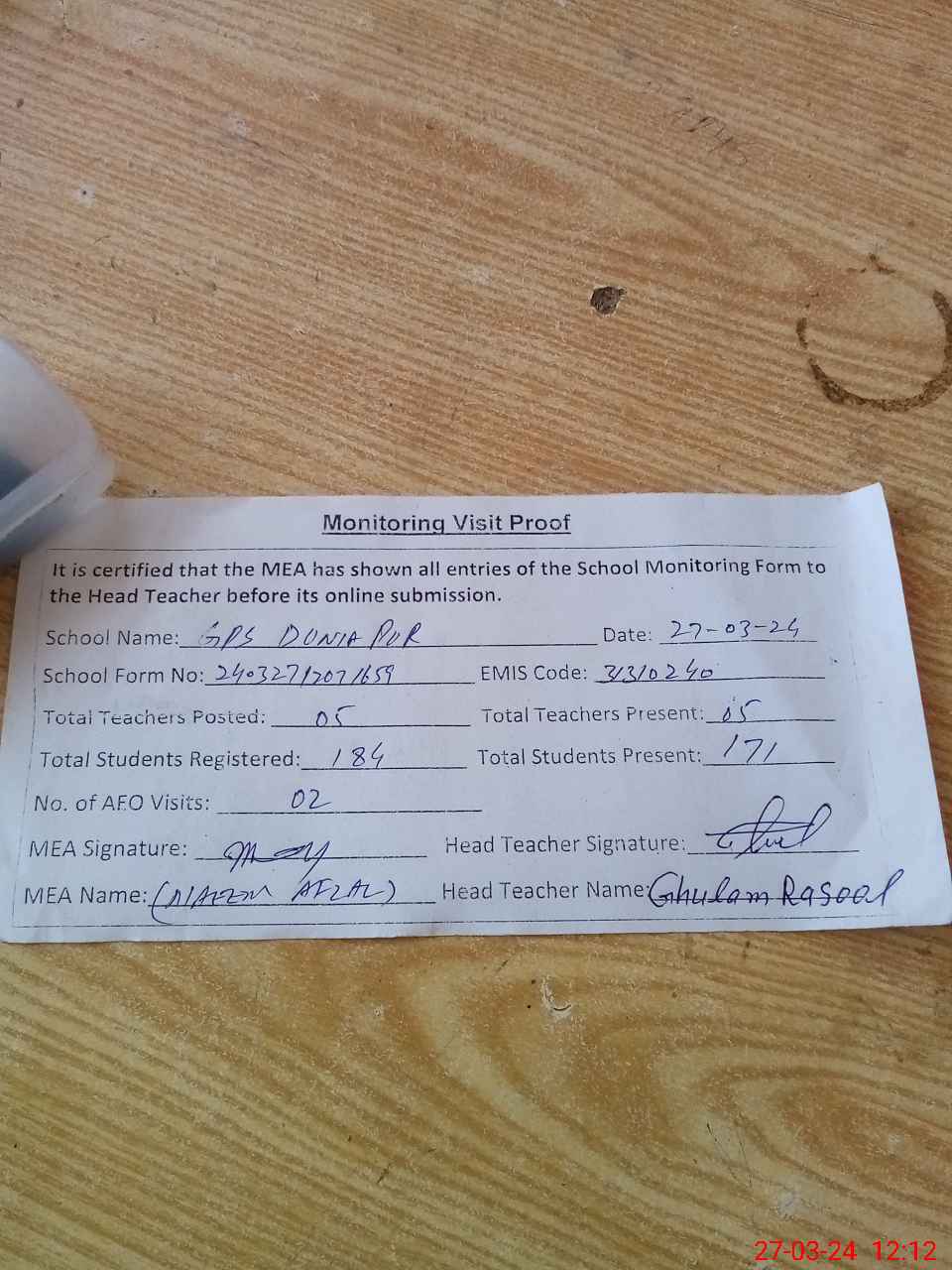 | Attendance Register | Head Teacher | MEA with School | Visit Proof |