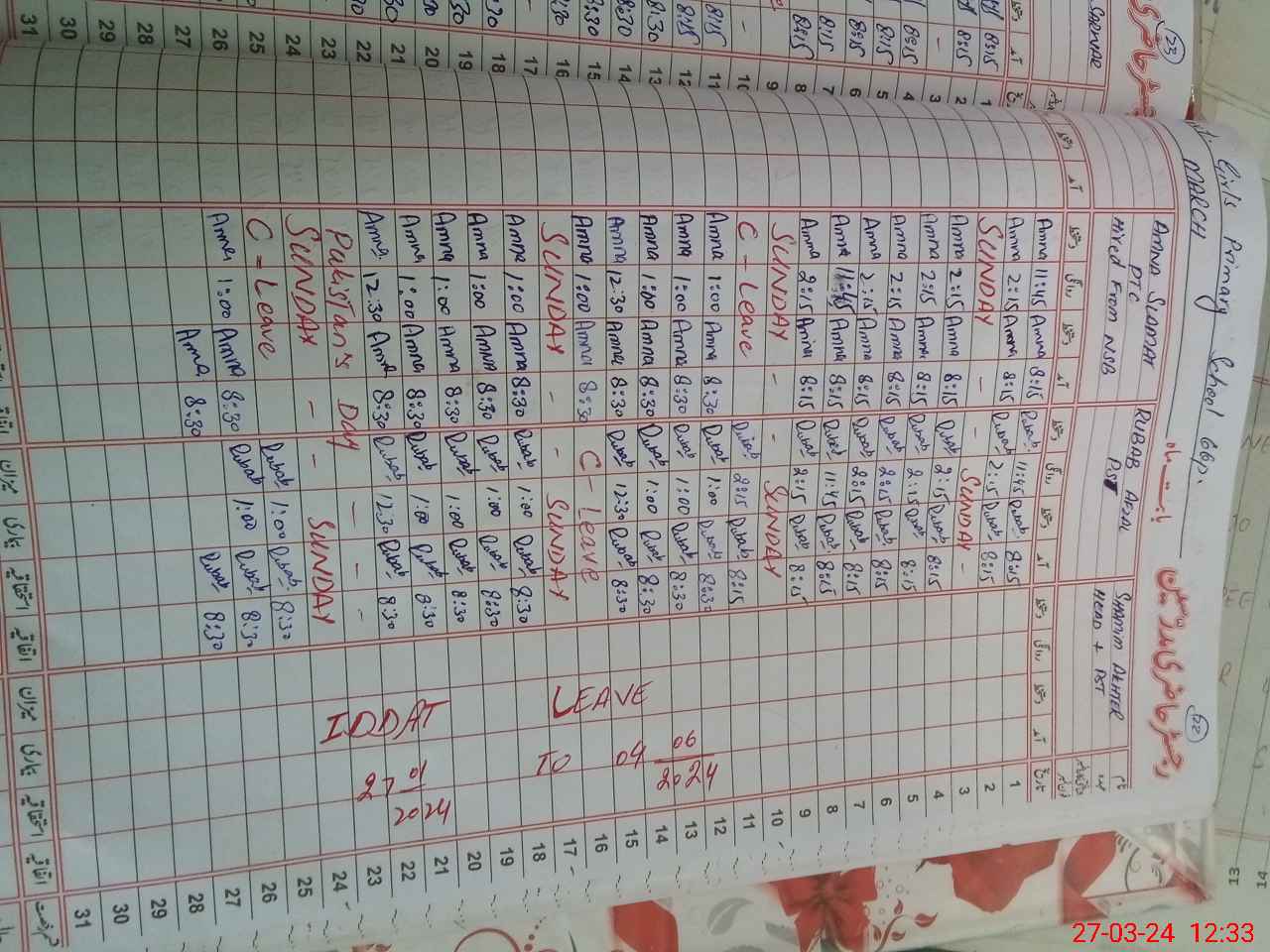 | Leave | Duty | Absent | Maternity | Medical | Ex- Pak |
