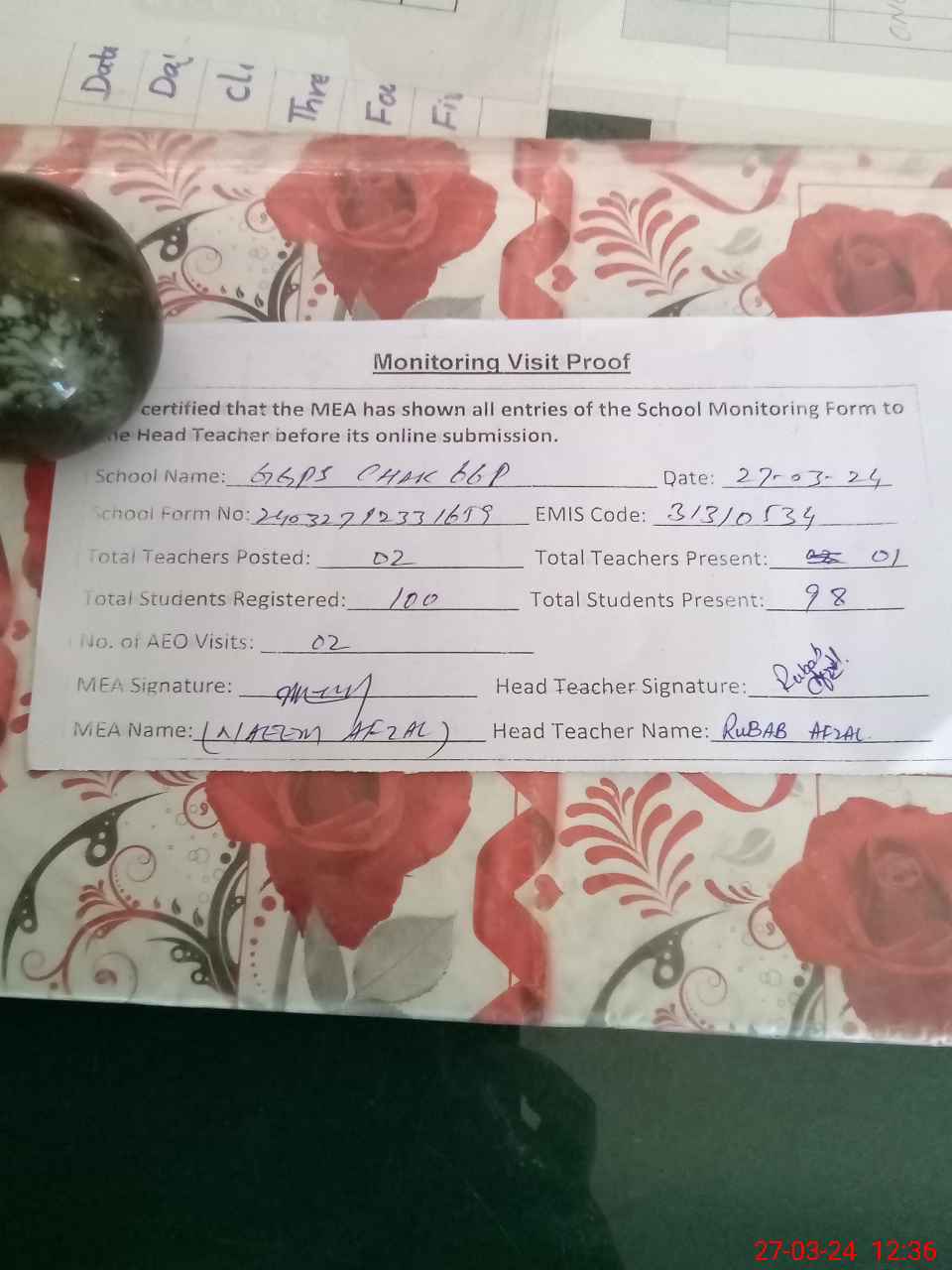 | Attendance Register | Head Teacher | MEA with School | Visit Proof |