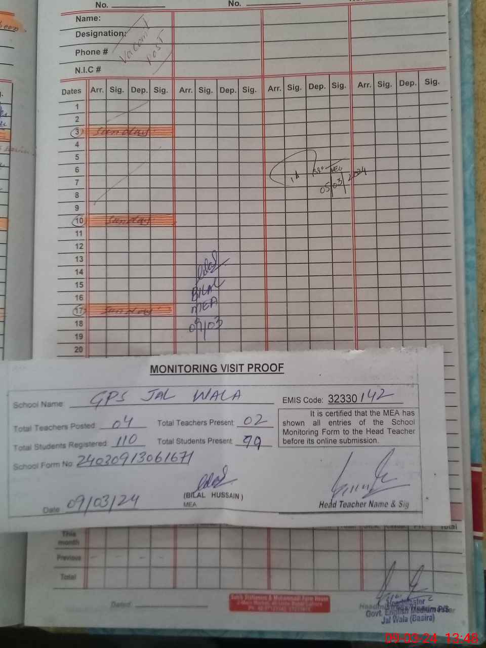 | Attendance Register | Head Teacher | MEA with School | Visit Proof |