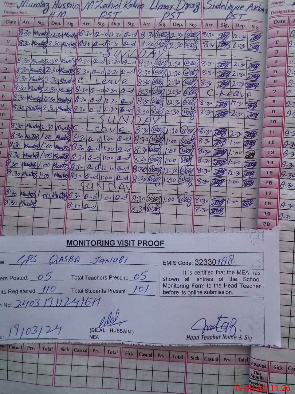 | Attendance Register | Head Teacher | MEA with School | Visit Proof |