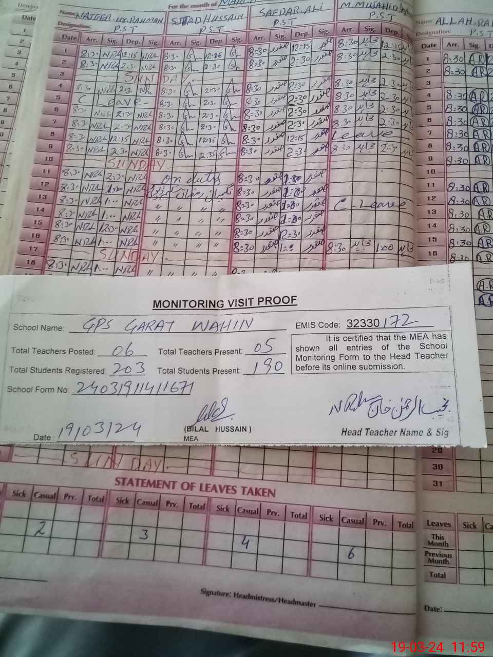 | Attendance Register | Head Teacher | MEA with School | Visit Proof |