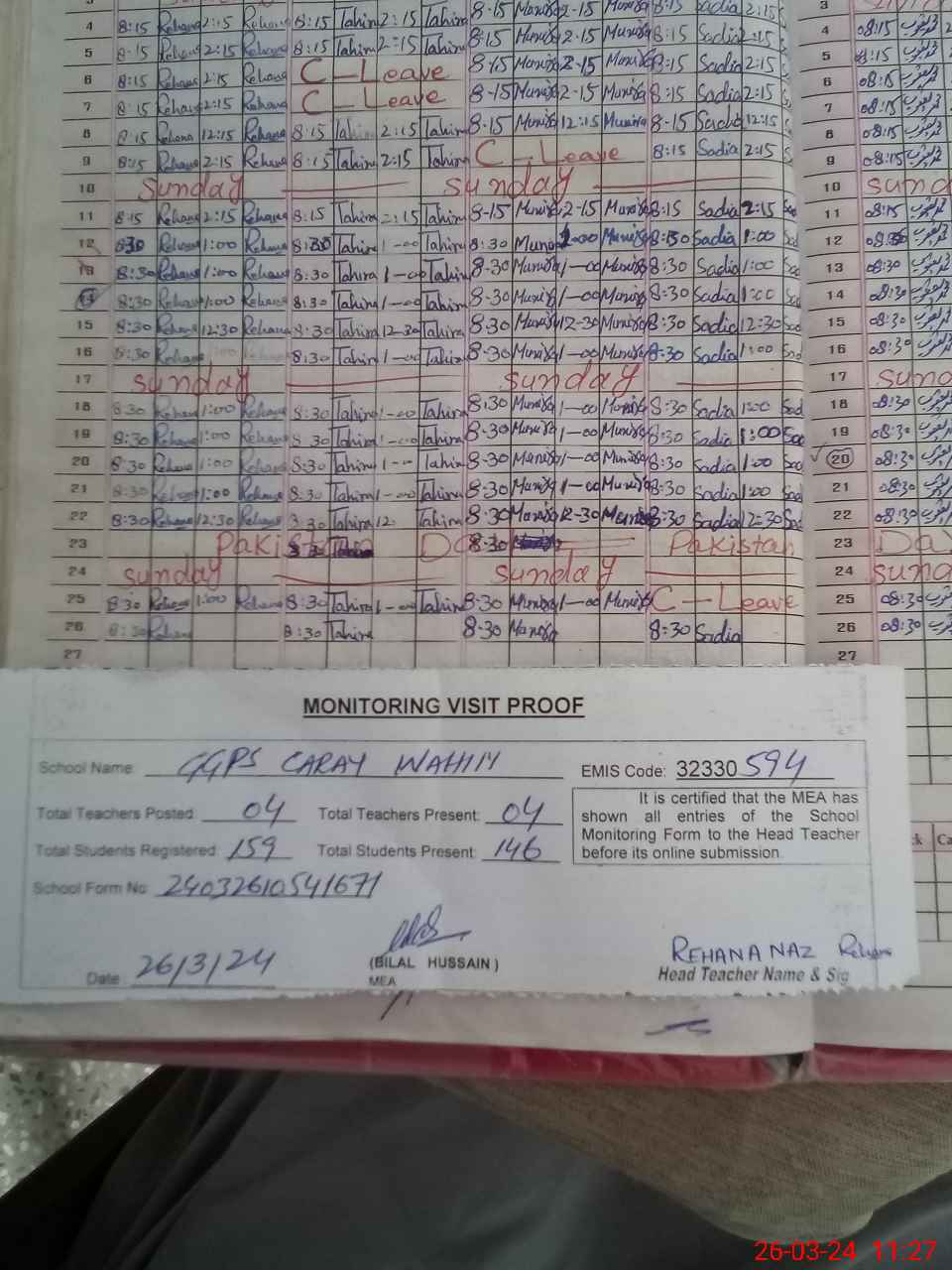 | Attendance Register | Head Teacher | MEA with School | Visit Proof |