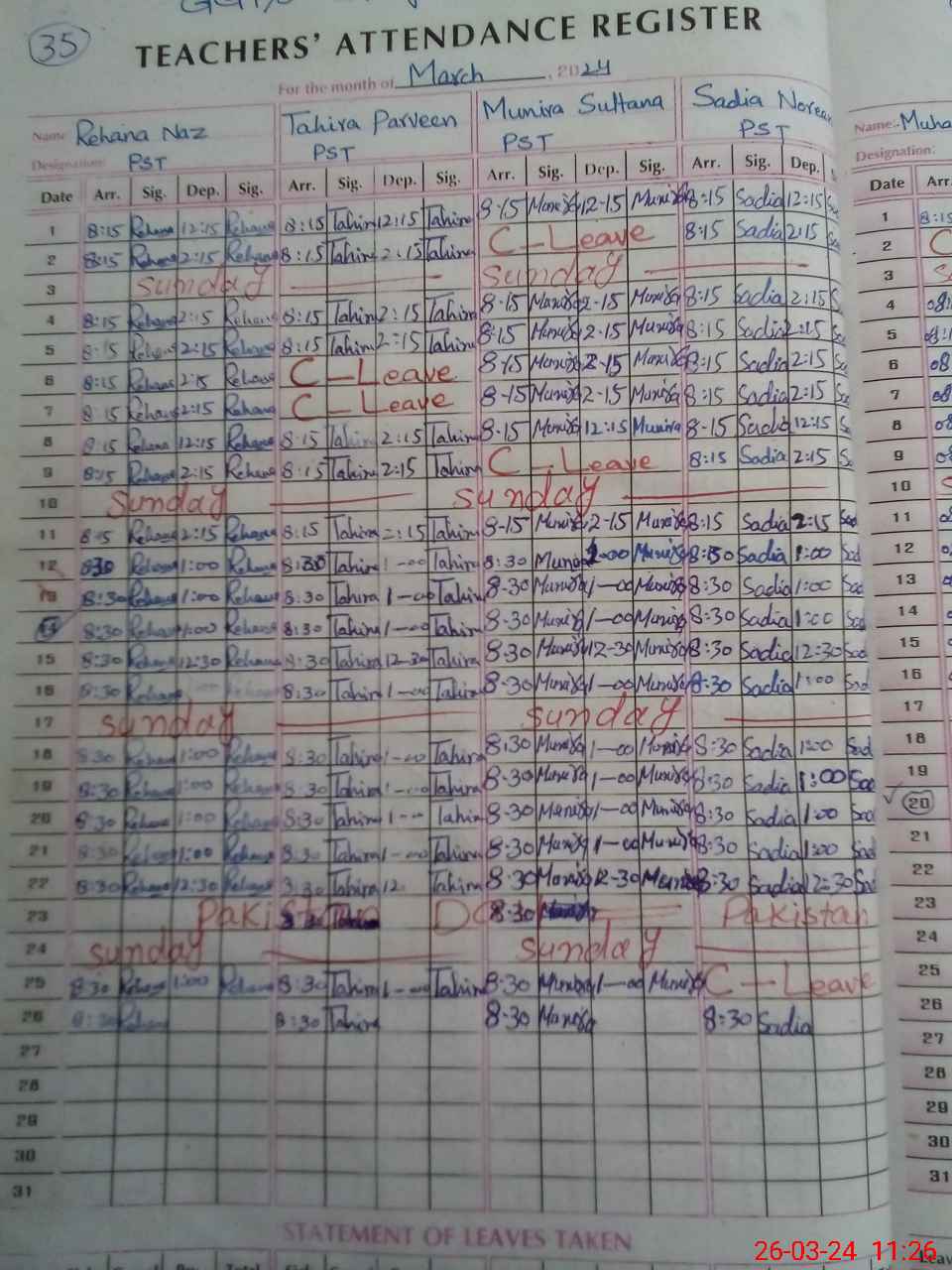 | Leave | Duty | Absent | Maternity | Medical | Ex- Pak |