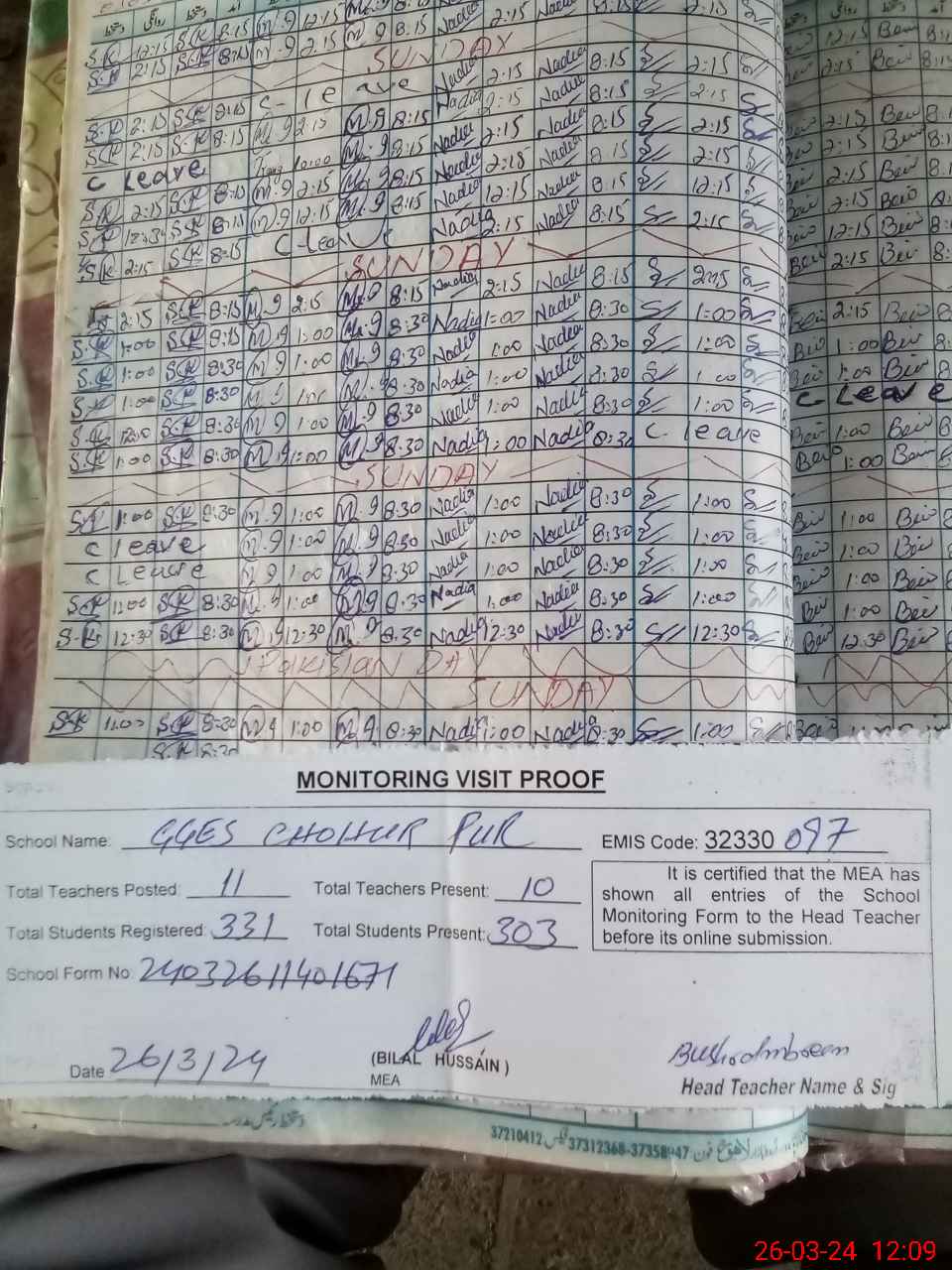 | Attendance Register | Head Teacher | MEA with School | Visit Proof |