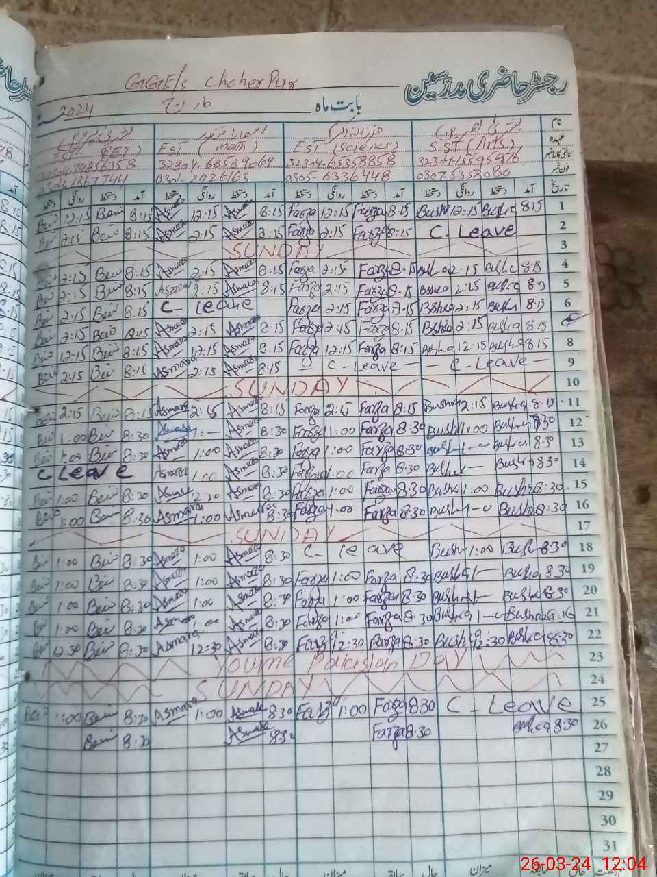 | Leave | Duty | Absent | Maternity | Medical | Ex- Pak |