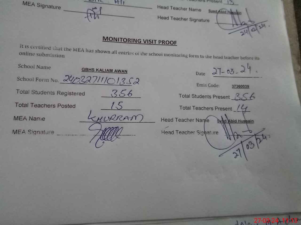 | Attendance Register | Head Teacher | MEA with School | Visit Proof |