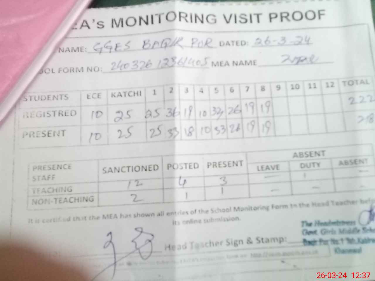 | Attendance Register | Head Teacher | MEA with School | Visit Proof |