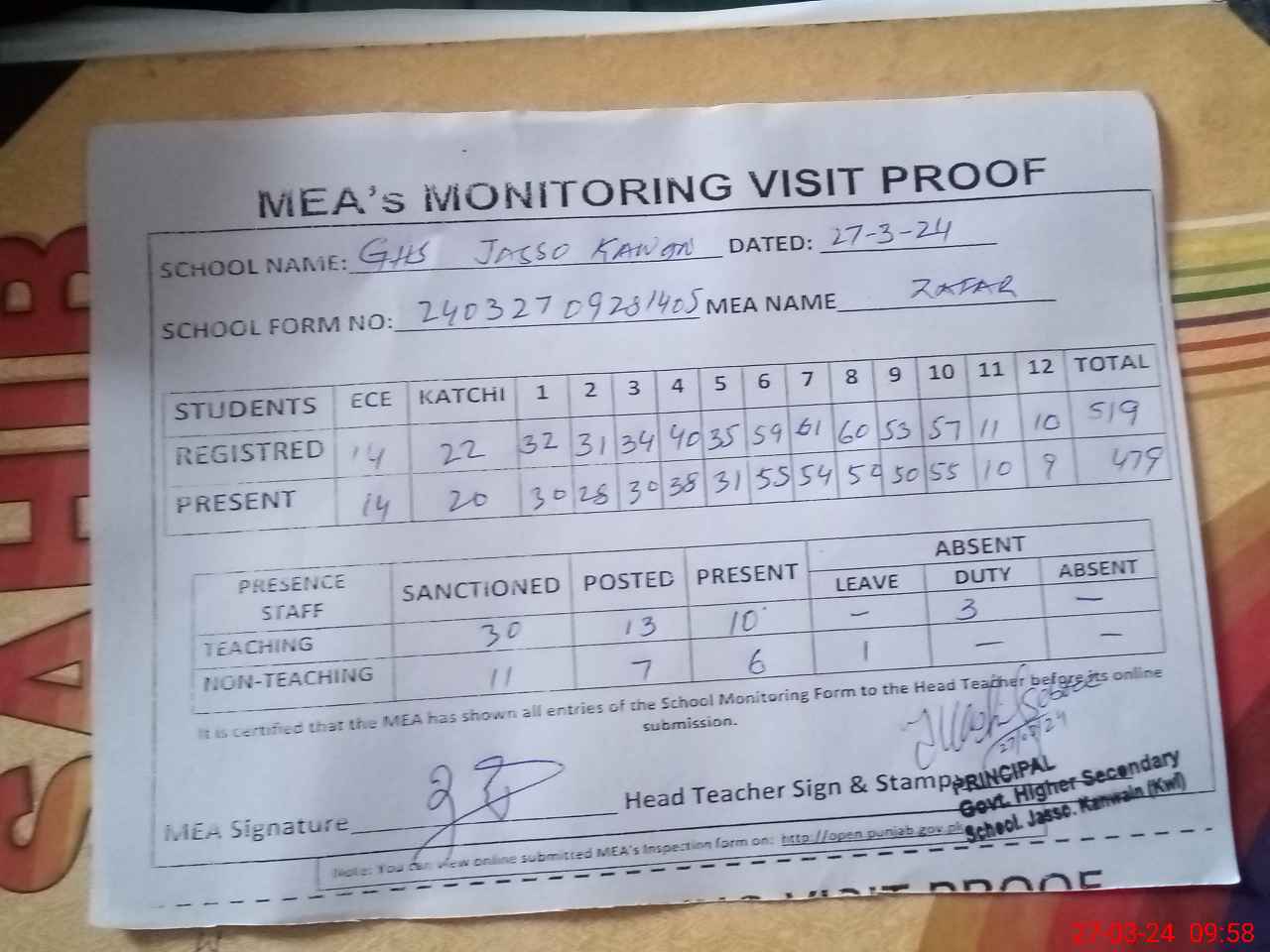 | Attendance Register | Head Teacher | MEA with School | Visit Proof |