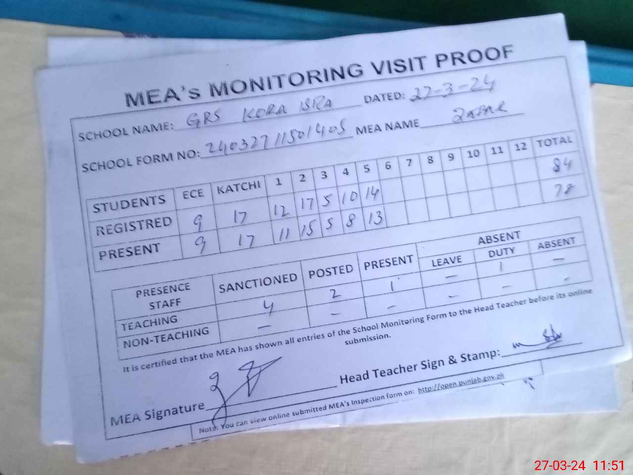 | Attendance Register | Head Teacher | MEA with School | Visit Proof |
