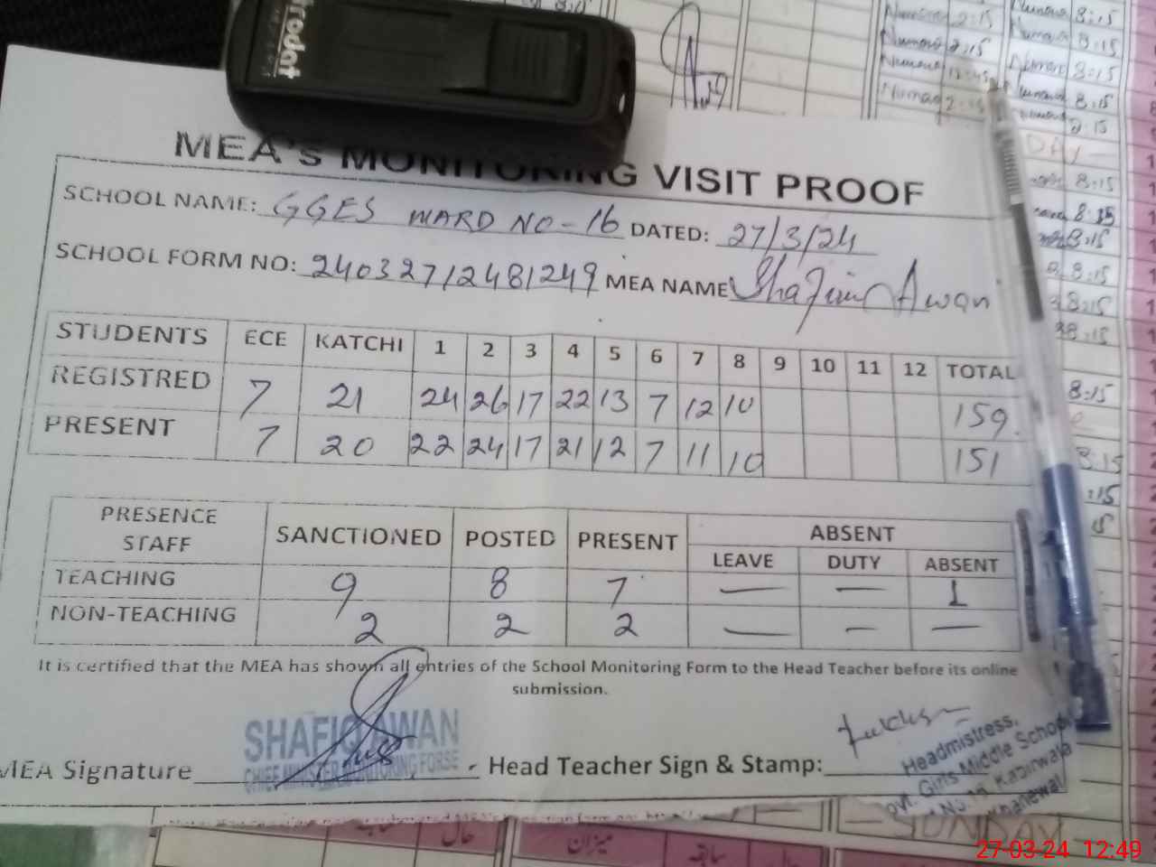 | Attendance Register | Head Teacher | MEA with School | Visit Proof |