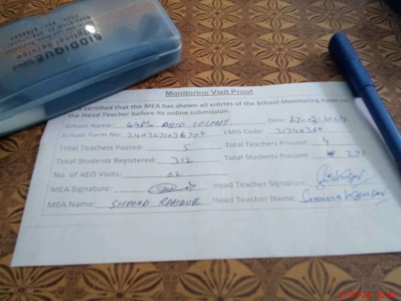 | Attendance Register | Head Teacher | MEA with School | Visit Proof |