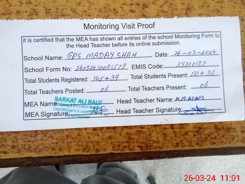 | EMIS Code: 39210137 | Name of School: GPS MADAY SHAH | |||