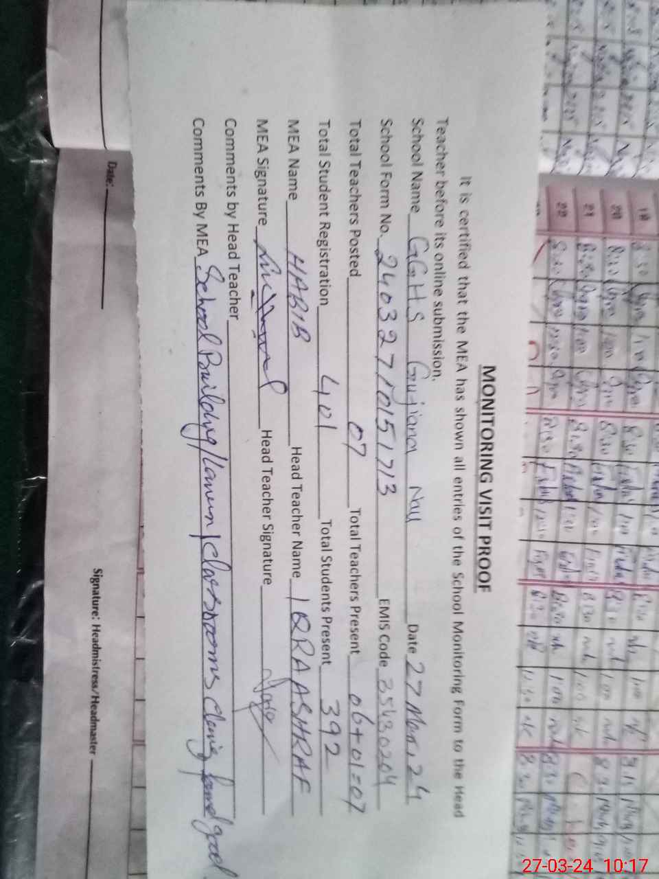 | Attendance Register | Head Teacher | MEA with School | Visit Proof |