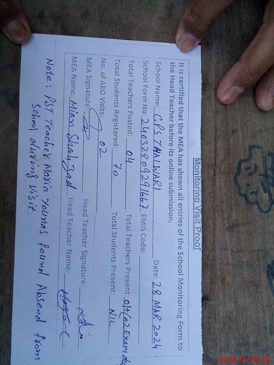 | Remarks (Use Separate Page if Required): PST teacher Miss Maria Younas found absent from school during visit | |||||