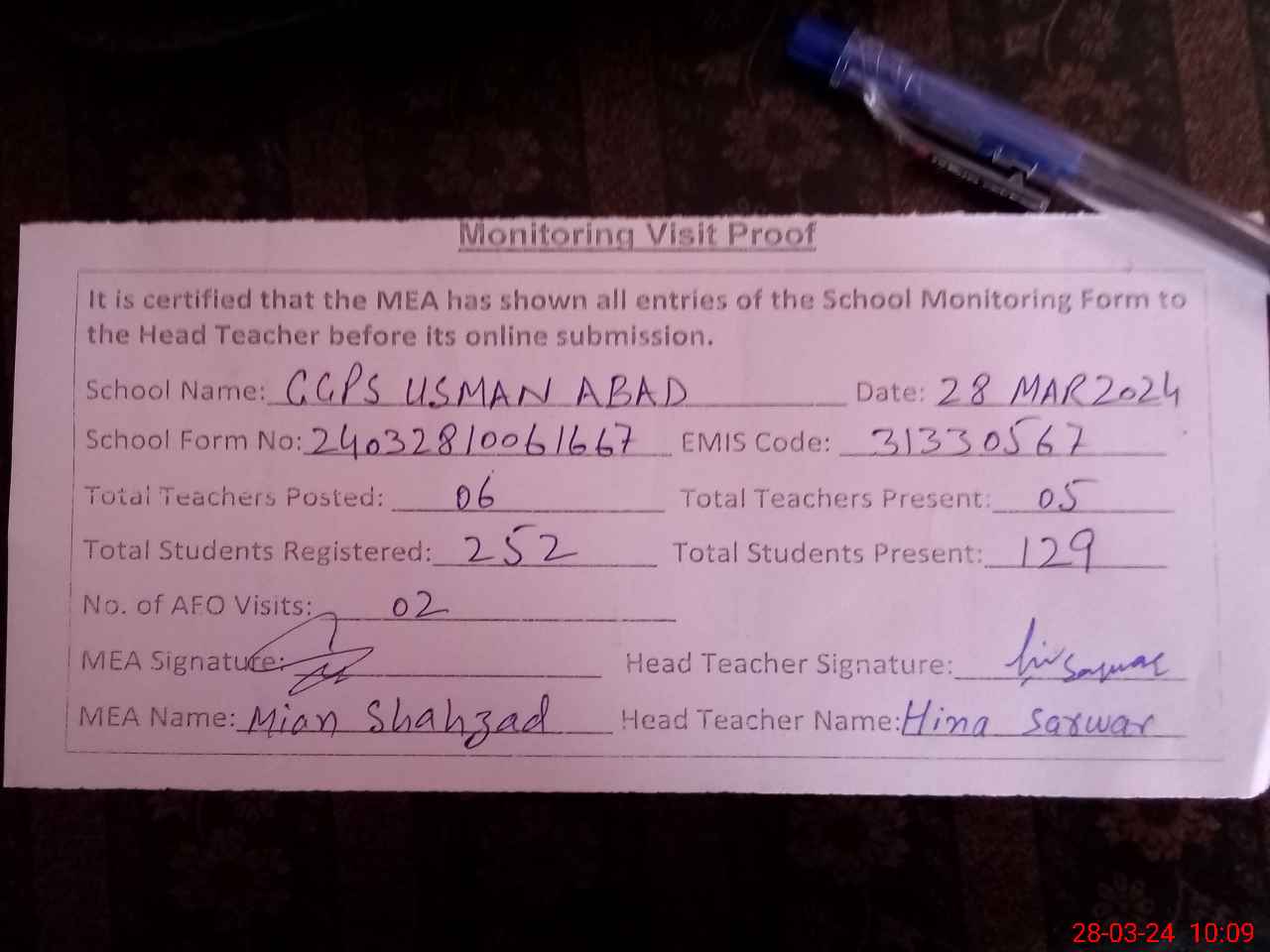 | EMIS Code: 31330567 | Name of School: GGPS USMAN ABAD | |||