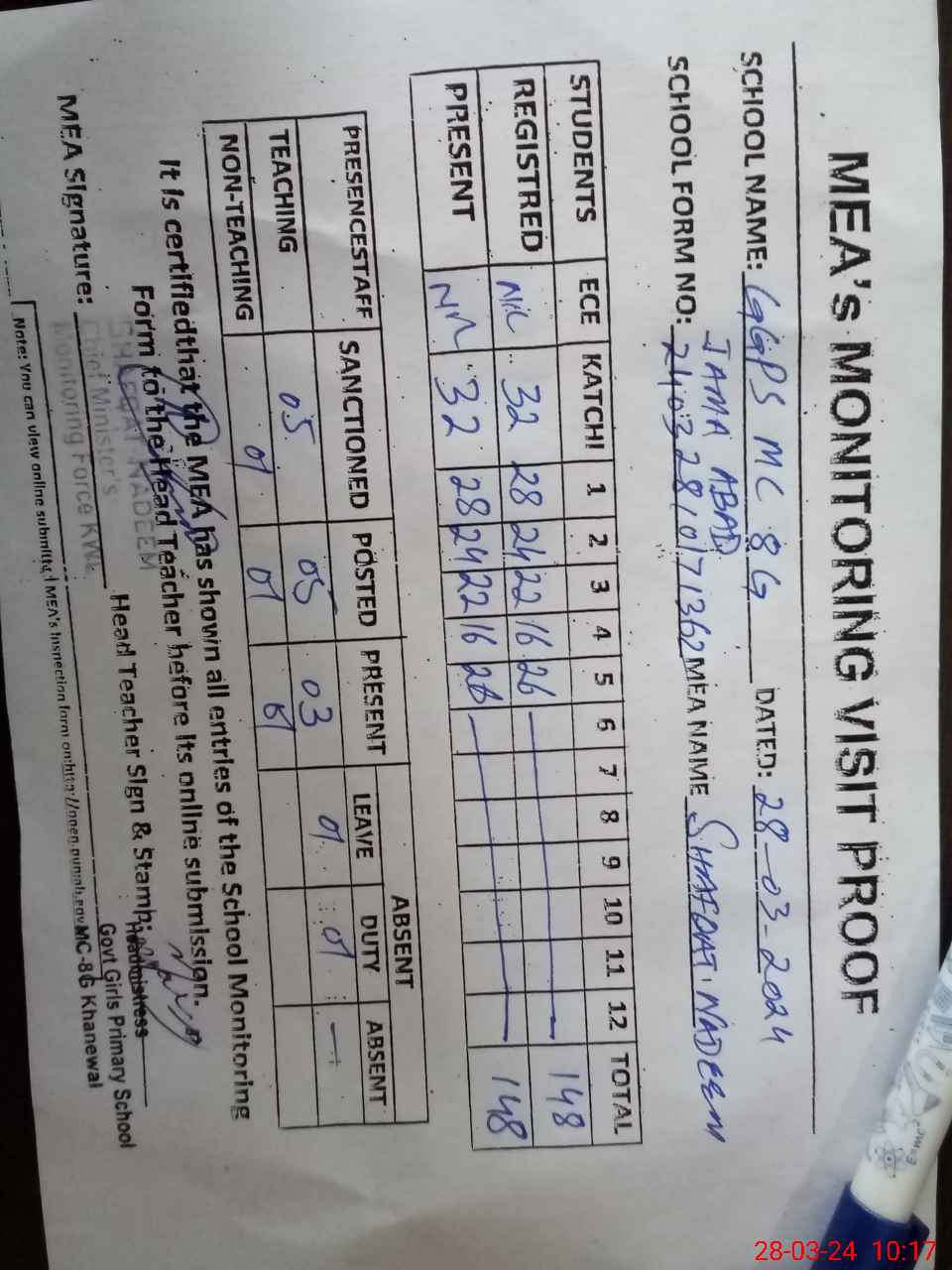 | Attendance Register | Head Teacher | MEA with School | Visit Proof |