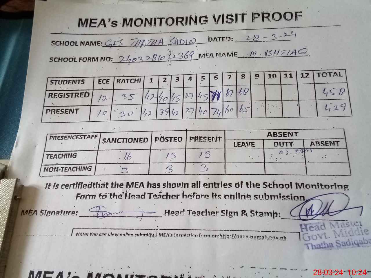 | Attendance Register | Head Teacher | MEA with School | Visit Proof |