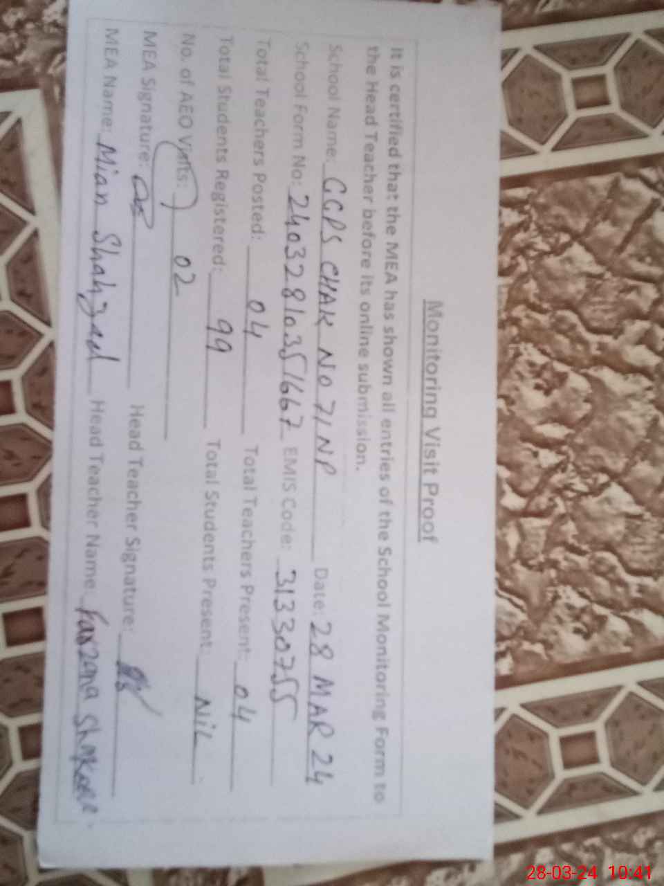 | Attendance Register | Head Teacher | MEA with School | Visit Proof |