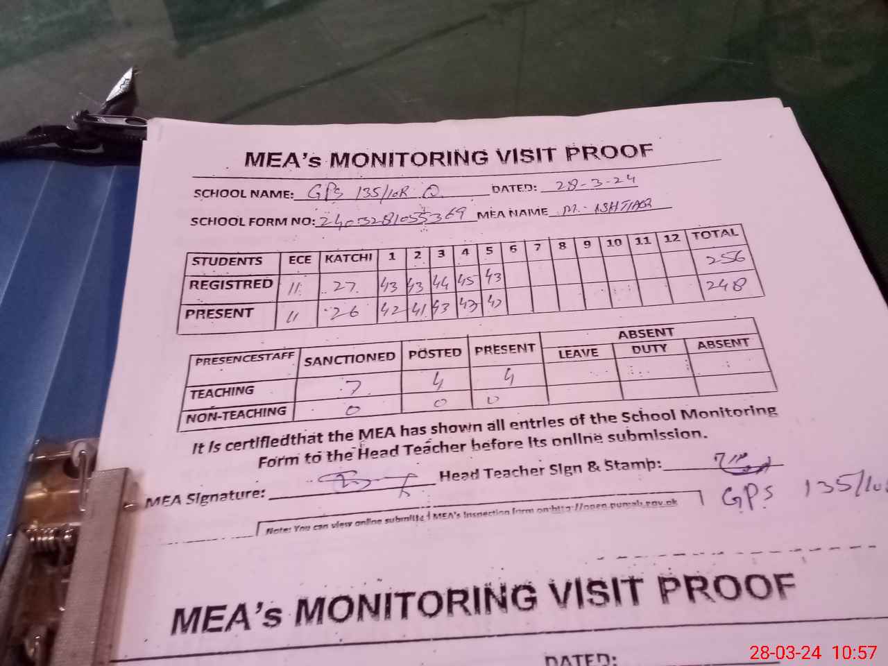 | Attendance Register | Head Teacher | MEA with School | Visit Proof |