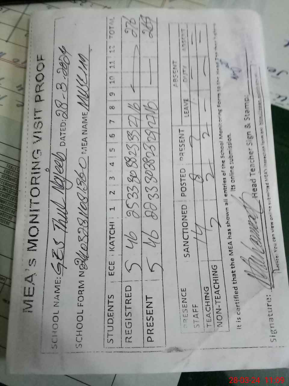 | Attendance Register | Head Teacher | MEA with School | Visit Proof |