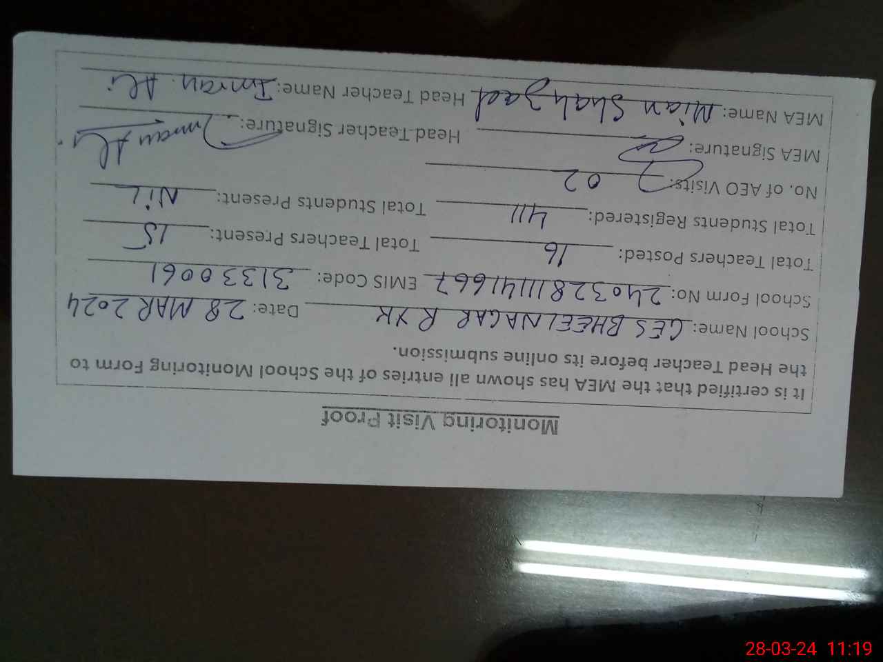 | Monitoring Date: 28-03-2024 | Start Time: 28-03-2024 10:54 AM | End Time: 28-03-2024 11:19 AM | Name of MEA: Sh**** Ah**** | |