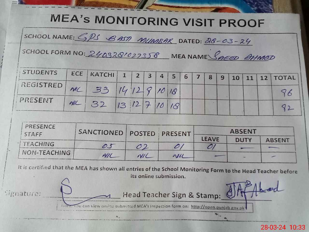 | Attendance Register | Head Teacher | MEA with School | Visit Proof |