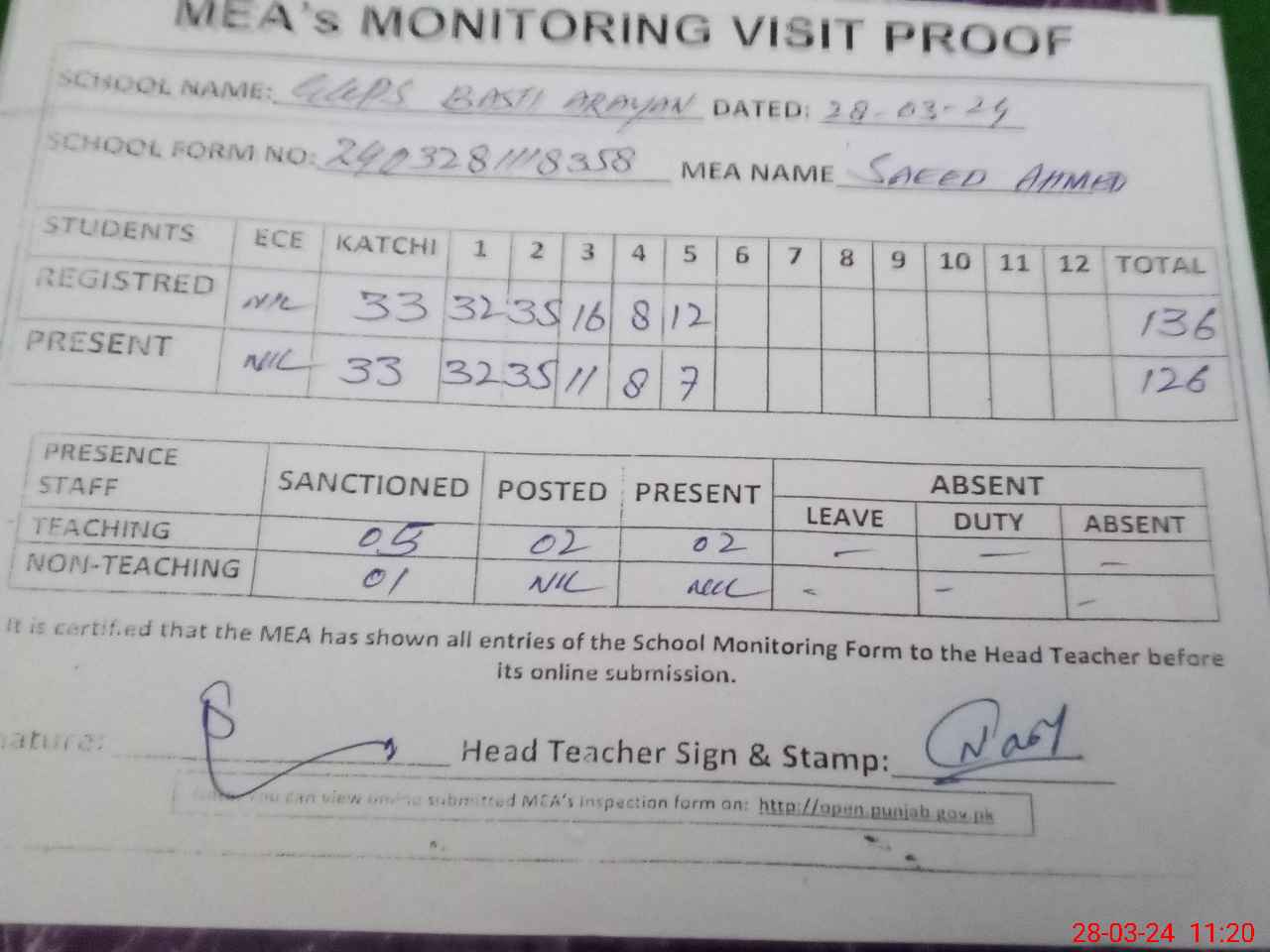 | Attendance Register | Head Teacher | MEA with School | Visit Proof |