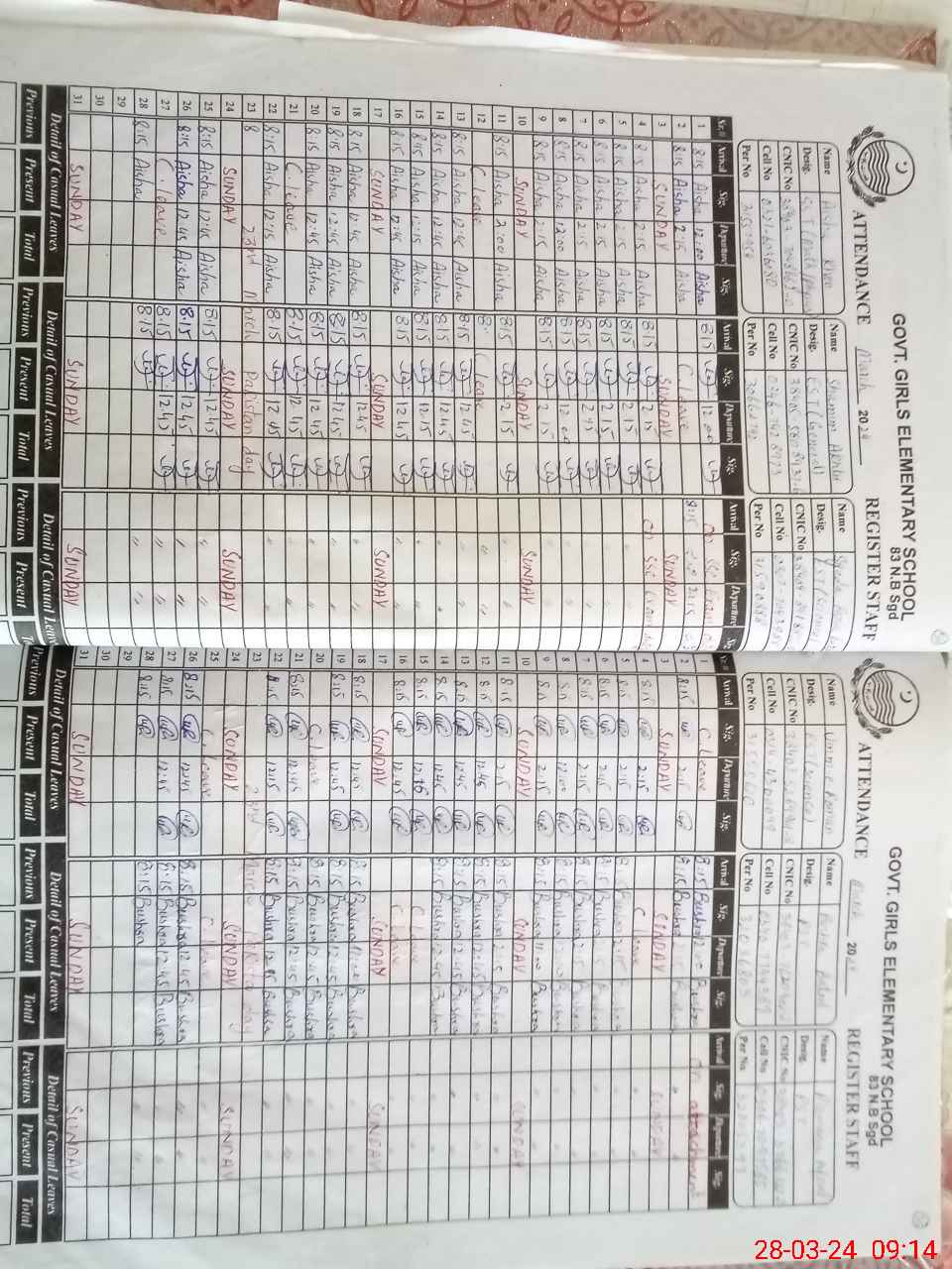 | CNIC | Full Name | Designation | R/C | Absence During Last Calender Month |