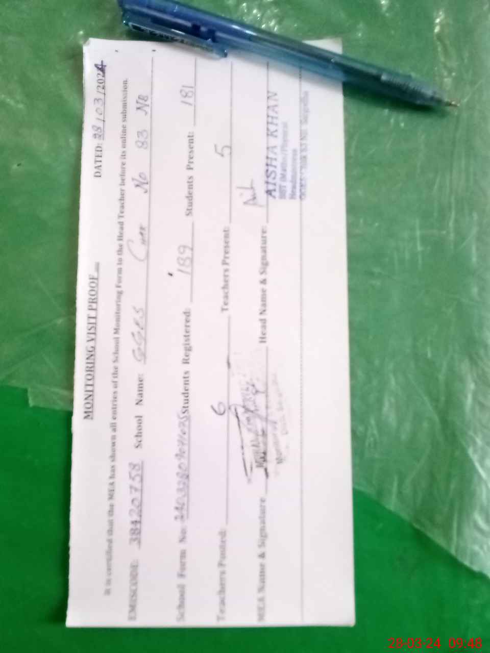 | Attendance Register | Head Teacher | MEA with School | Visit Proof |
