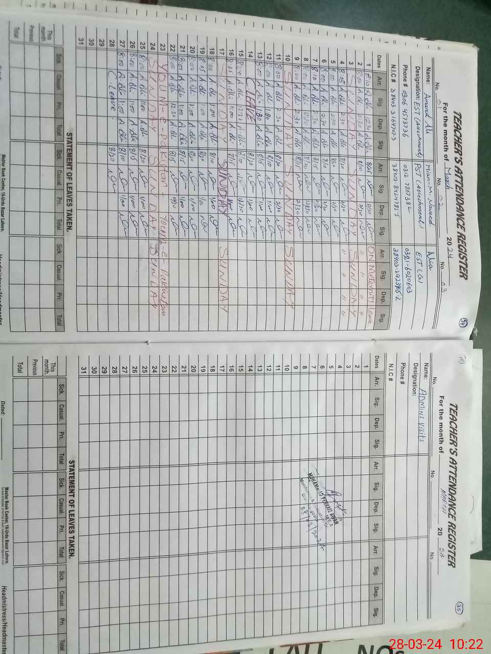 | Name: AL**** Designation: (School Headmaster's/Headmistress's) EST (GENERAL) Phone/Cell Number: 03**** |