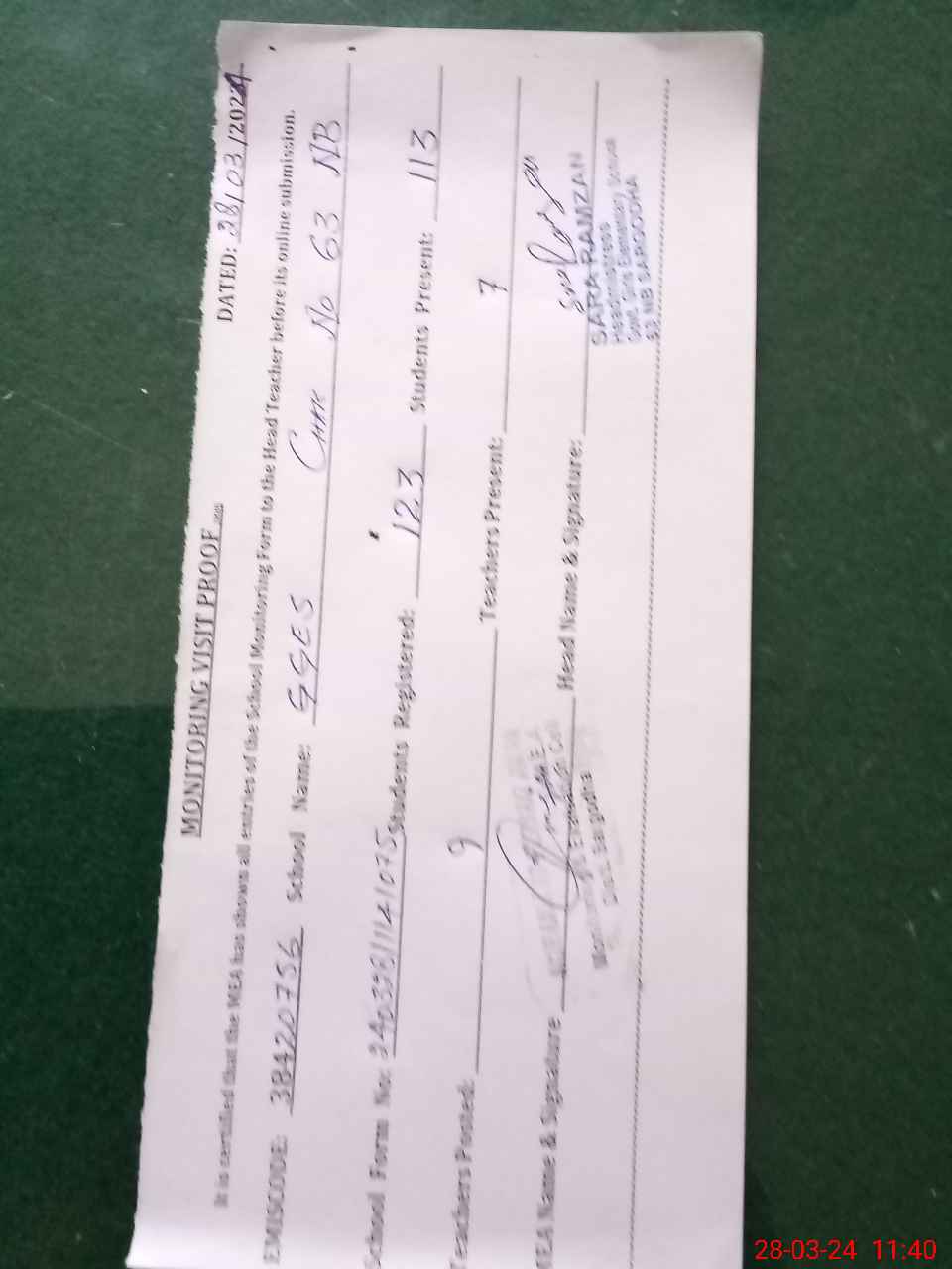 | Attendance Register | Head Teacher | MEA with School | Visit Proof |