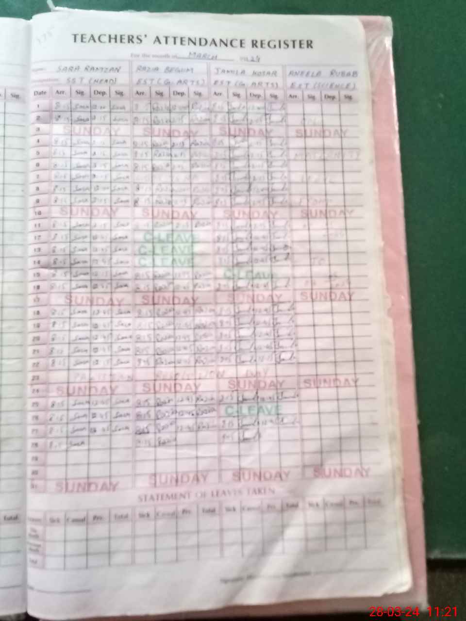 | Leave | Duty | Absent | Maternity | Medical | Ex- Pak |