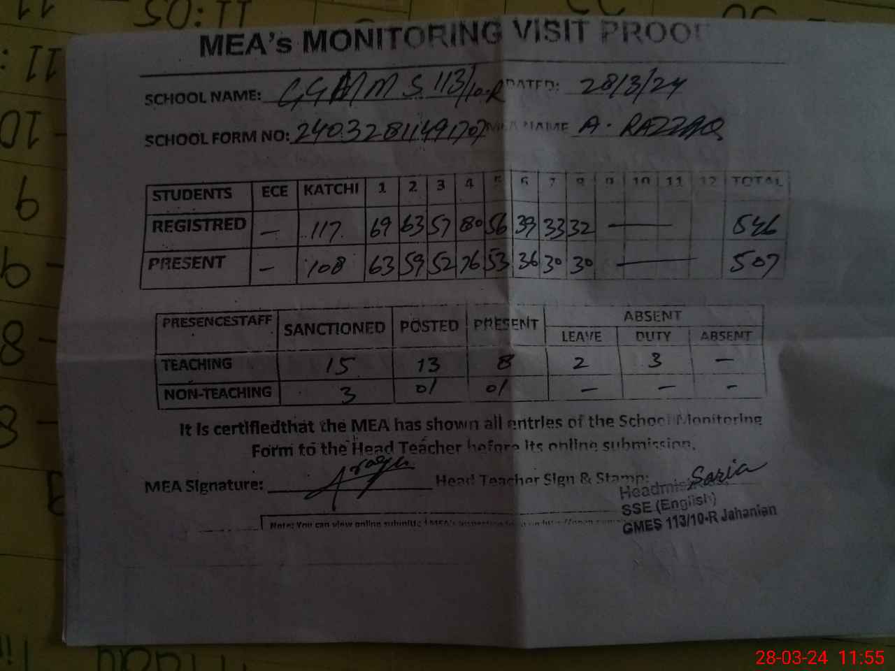 | Attendance Register | Head Teacher | MEA with School | Visit Proof |