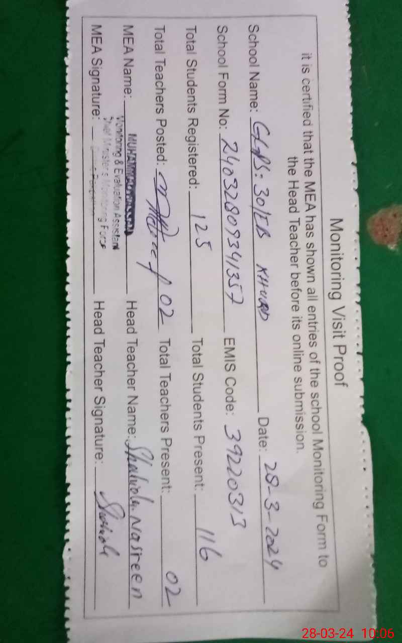 | EMIS Code: 39220313 | Name of School: GGPS CHAK 30/EB KHURD P/O 30/EB KALAN | |||